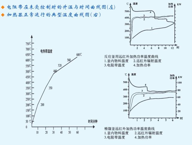 b、運行方式對比:電熱油浴是在釜的夾套中注入導(dǎo)熱油、油中插人電加熱管,由電加熱管通電加熱導(dǎo)熱 油,間接使釜升溫。由于導(dǎo)熱油是不流動的、且傳熱系數(shù)小、熱效率低、無形中必須要將夾套內(nèi)油加熱到一 定的溫度、要多消耗一部分電能屬“二傳手加熱”;而且導(dǎo)熱油常期在高溫情況下易老化結(jié)碳、嚴重影響了傳 熱效果(每年需要更換導(dǎo)熱油幾次)。另外電加熱管本身的使用壽命短(國家標準在3000小時以內(nèi))加上管的 表面發(fā)熱與油直接接觸短、時間長就會結(jié)焦,電加熱管的熱量無法傳出很容易造成電熱管燒壞,并且更換電 熱管相當麻煩、必須停機要將夾套內(nèi)油全部放掉,影響了正常生產(chǎn)。另外電熱管使用不安全不能達到防爆 要求。而遠紅外加熱技術(shù)它多數(shù)可采用“集裝式和密封防爆式”兩種加熱形式,是直接與釜體組裝連接在一 體(輻射面與釜壁間隙約6mm),外觀如同容器一樣美觀、運行無噪音、無污染、操作簡便、改善了操作環(huán)境。 降低了勞動強度,加熱部分可分為上、中、下分段單獨控制加熱、控制部分可通過P,D調(diào)功和調(diào)壓。操作,任 意調(diào)整功率大小,并能自動加熱恒溫、根據(jù)用戶要求加熱設(shè)備的控制也可與計算機、打印機、智能編程相配 套使用,自動化程度高。