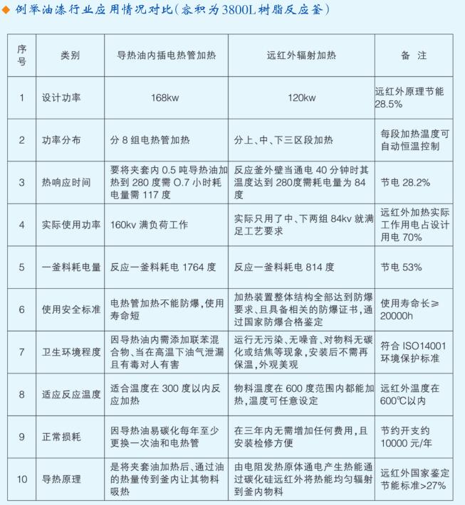 e、對環(huán)境影響對比:電熱油浴加熱時。隨著導(dǎo)熱機油濕度的升高,夾套上排空口不斷有有害氣體排出 對人體有害,因油泄露且造成環(huán)境污染;電熱管接線區(qū)在高溫下油不斷地流到接線部位上很容易造成燃燒、 發(fā)生意外事故。而遠紅外加熱方式,運行無污染,達到防爆要求,遠紅外輻射反而對人體有益,屬潔凈生產(chǎn)工 藝符合IS014001環(huán)境管理體系的要求。