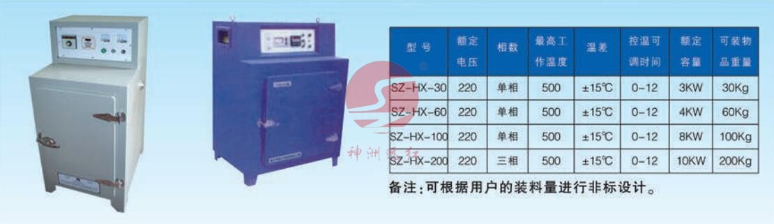 SZ-HX系列烘箱,外箱采用鋼板構(gòu)造,內(nèi)層采用不銹鋼制成。夾體間內(nèi)填硅酸鋁保溫氈,內(nèi)箱體采用抽屜結(jié)構(gòu),內(nèi)部加熱元 件分遠紅外電加熱管或遠紅外電加熱板兩種并采用自動恒溫控制,以下是通用型號的烘箱規(guī)格、型號